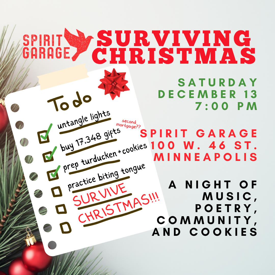 The holiday season can be full of stress, busyness, and high expectations. Meanwhile, conflict and disconnect are all around us, even in our families. In times like these, how do we reclaim the magic and wonder of Christmas? For Spirit Garage’s 2025 Christmas show, we will have a night of music, readings, cookies, and community that help us get to the heart of the season. Come as you are, and hopefully you will leave with a greater sense of peace, wonder, and hope.
