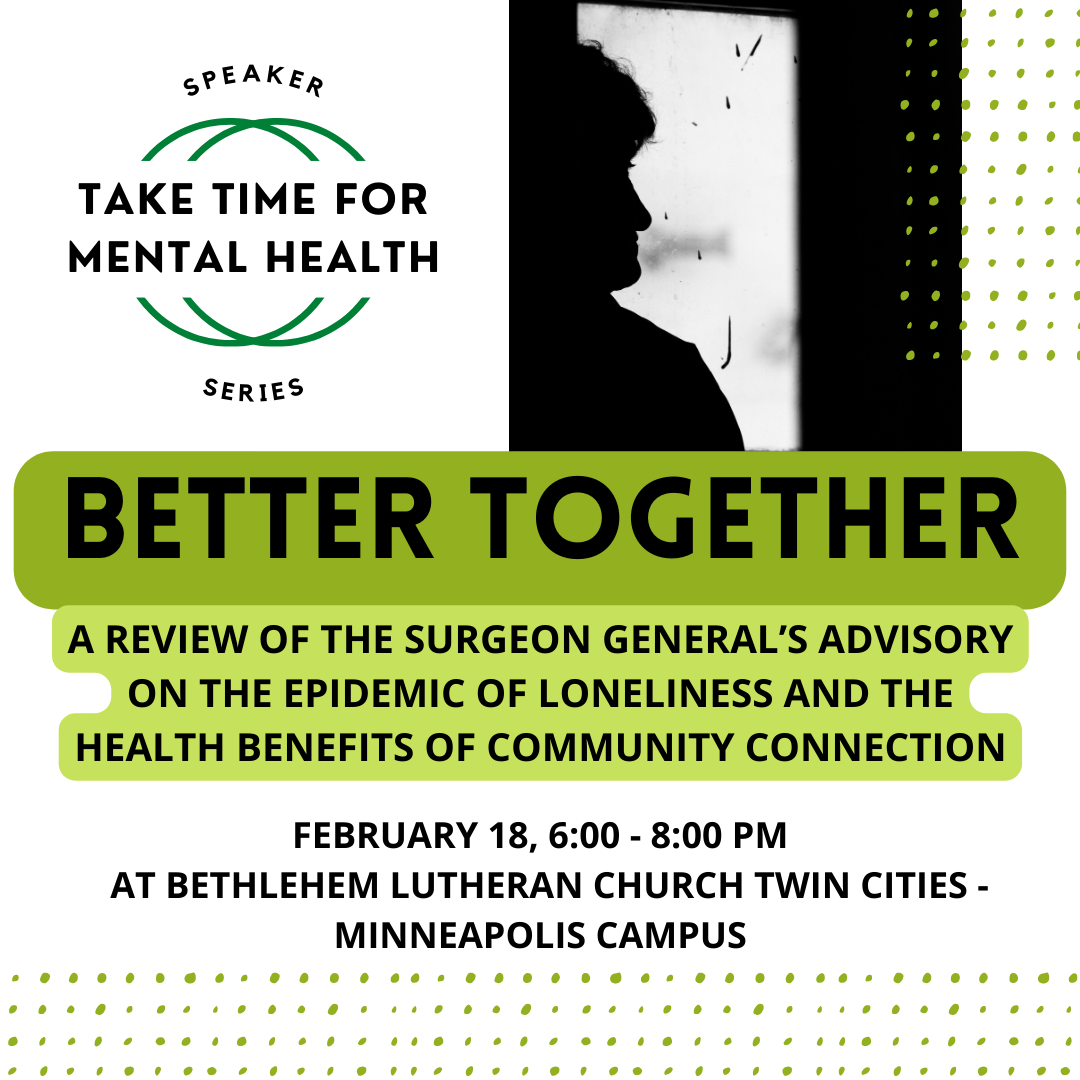Hosted by collaborating congregations Bethlehem Lutheran Church Twin Cities and St. Joan of Arc Catholic Community, Take Time for Mental Health is a monthly series that aims to increase awareness and reduce the stigma of mental illness.